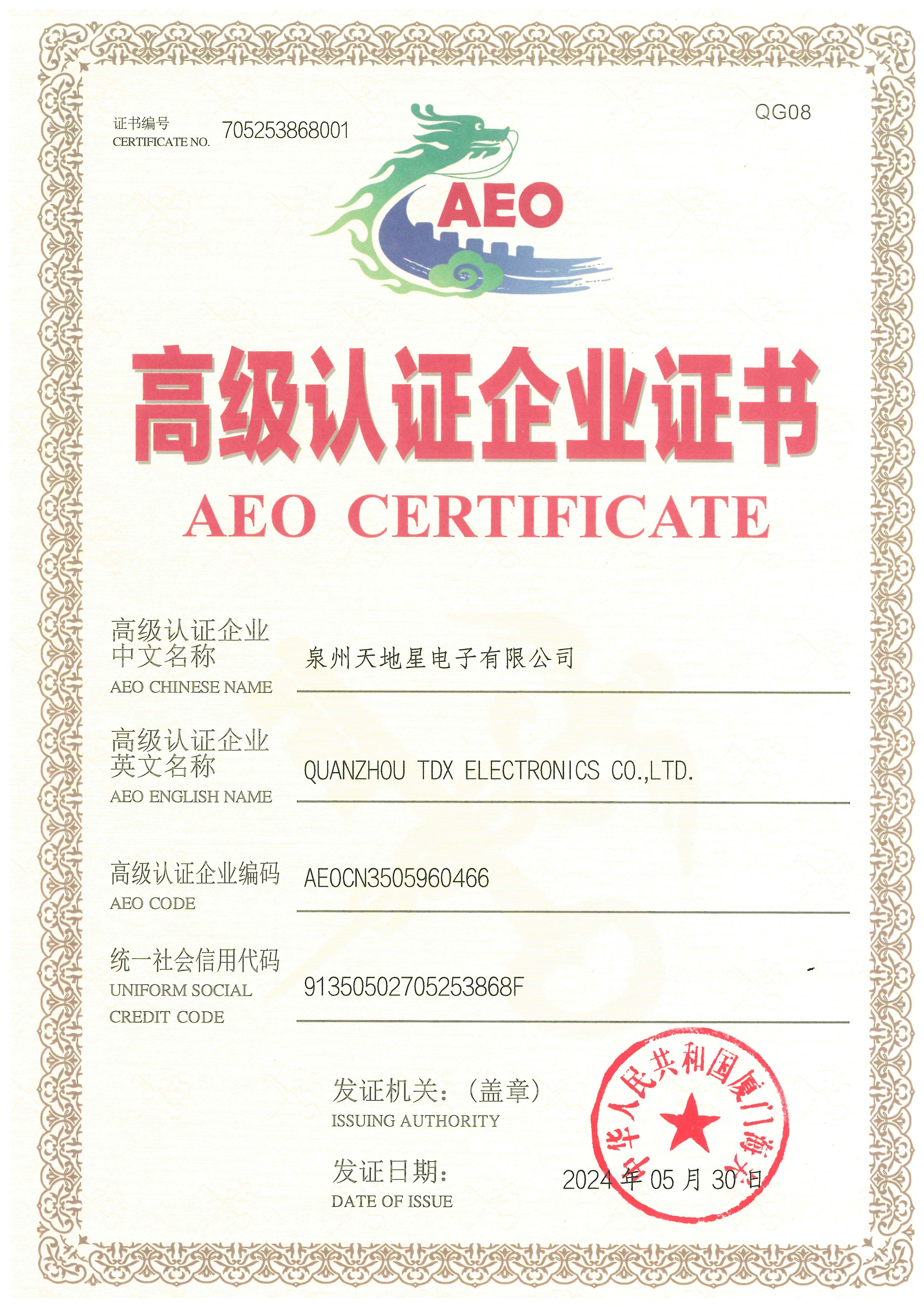 AEO海關 高級認證企業(yè)證書